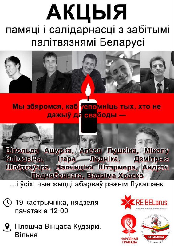 Мы збяромся, каб успомніць тых, хто не дажыў да свабоды — Вітольда Ашурка, Алеся Пушкіна, Міколу Клімовіча, Ігара Ледніка, Дзмітрыя Шлётгаўэра, Валянціна Штэрмера, Андрэя Паднябеннага, Вадзіма Храско — і ўсіх, чые жыцці абарваў рэжым Лукашэнкі.