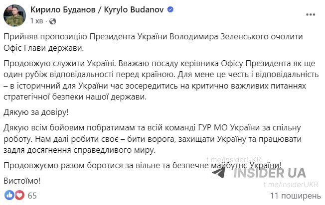 Принял предложение Президента Украины Владимира Зеленского возглавить Офис Президента, — Буданов Под… 02.01.2026Нацыянальная бясьпека. Дайджэст Принял предложение Президента Украины Владимира Зеленского возглавить Офис Президента, — Буданов Подписаться на INSIDER UA | Прислать контент