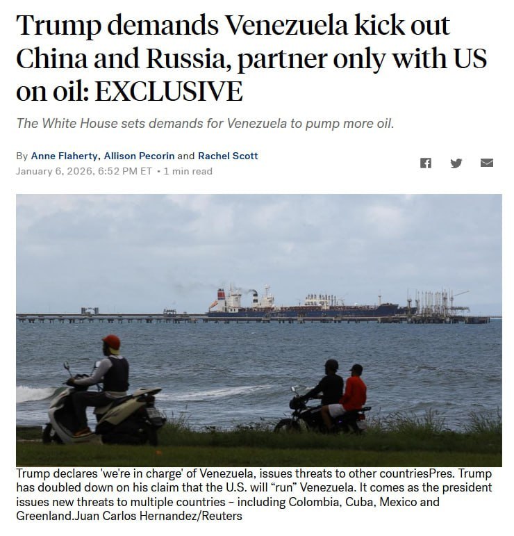 Трамп требует от Венесуэлы прекратить все связи с Россией, Китаем, Ираном и Кубой, а также согласить… 07.01.2026Нацыянальная бясьпека. Дайджэст Трамп требует от Венесуэлы прекратить все связи с Россией, Китаем, Ираном и Кубой, а также согласиться на исключительное сотрудничество с США в сфере добычи и продажи нефти, пишет ABC News.#ВенесуэлаВоенный Осведомитель