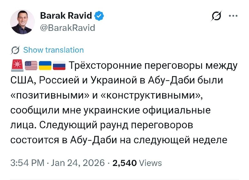 “Трёхсторонние переговоры между США, Россией и Украиной в Абу-Даби были «позитивными» и «конструктивными», сообщили мне украинские официальные лица. Следующий раунд переговоров состоится в Абу-Даби на следующей неделе”, – Барак Равид, Axios.