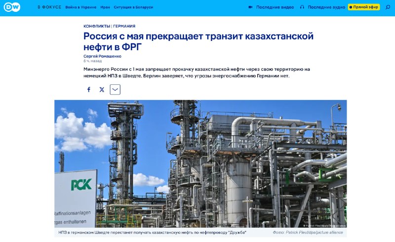оказалась северная ветка, по которой транспортируется казахстанская нефть в Германию.
