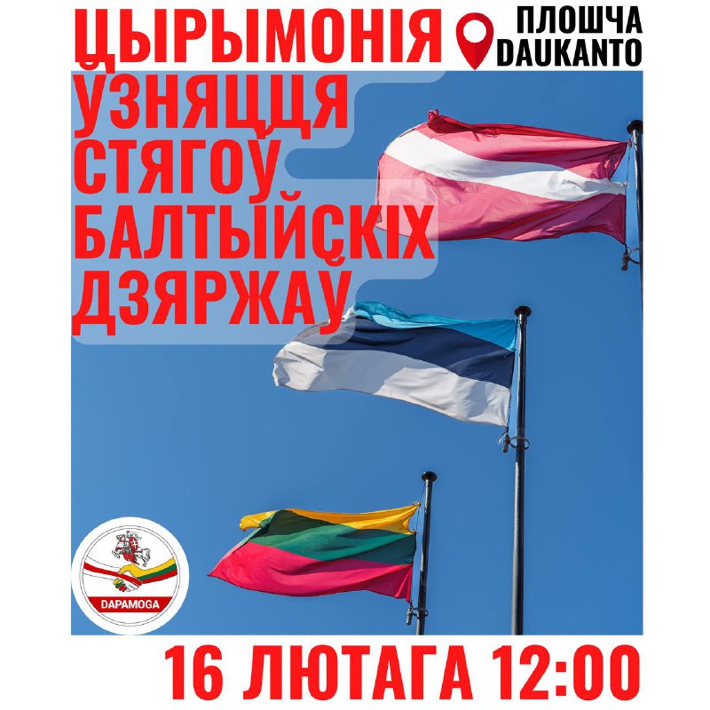 Далучаемся да святкавання Дня аднаўлення Літоўскай дзяржавы і запрашаем беларусаў у панядзелак, 16 лютага, а 12:00 на плошчу Simono Daukanto на урачыстую цырымонію ўзняцця сцягоў трох Балтыйскіх дзяржаў.