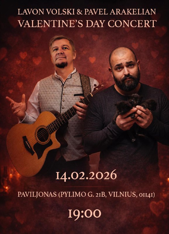 Навіна №1 У суботу, 14 лютага, у віленскім бары Paviljonas з святочнай праграмай да Дня святога Валянціна дуэтам выступяць Лявон Вольскі і Павел Аракелян!