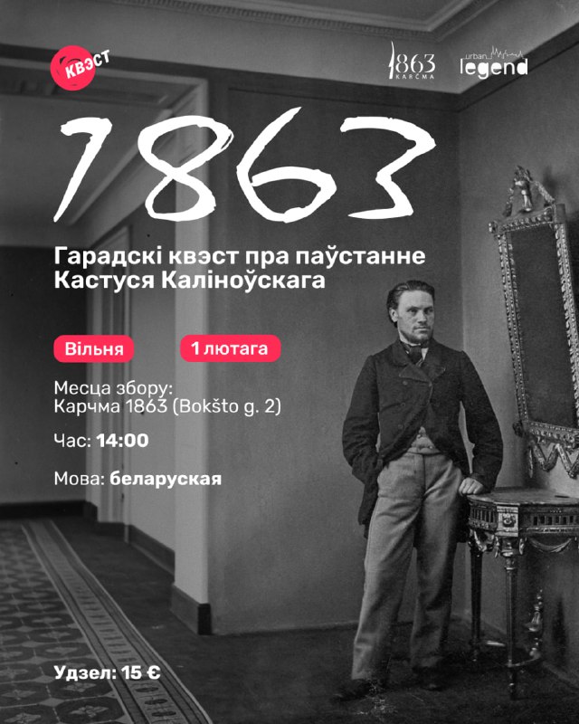 У нядзелю, 1 лютага, а 14:00 мы будзем рады сустрэцца ў «Карчме 1863», дзе распачнецца квэст, які потым скончыцца вясёлай паўстанцкай вечарынкай у гонар спадара Кастуся!
