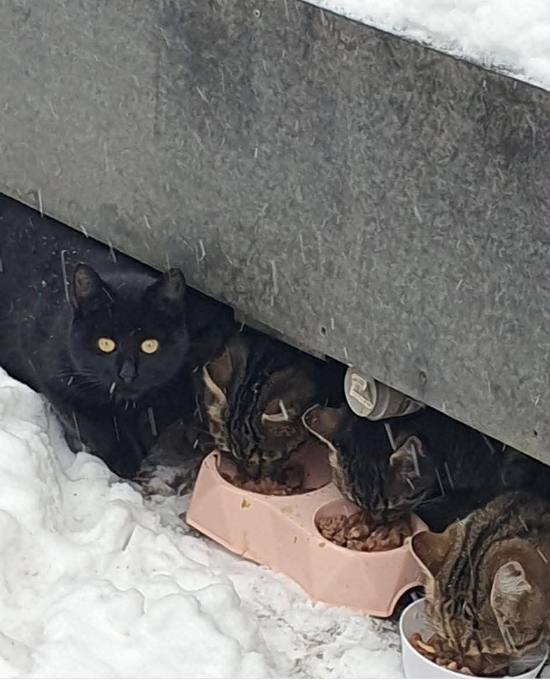 Я и ещё одна женщина кормим их тёплой едой 3 раза в день