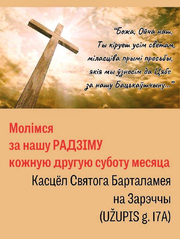 Далучайцеся да малітвы аб Беларусі Кожная другая субота месяца, 18:00.Набажэнства праходзіць на бела… 06.10.2024Dapamoga LT | Замак у Вільнюсе Далучайцеся да малітвы аб Беларусі Кожная другая субота месяца, 18:00.Набажэнства праходзіць на беларускай мове.Užupio g. 17a