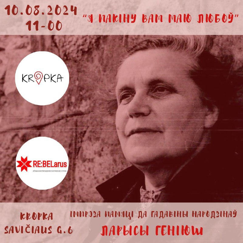 У суботу 10 жніўня а 11 гадзіне запрашаем у Kropku на імпрэзу памяці легендарнай беларускай паэткі Ларысы Геніюш, ахвярнай хрысьціянкі, нязломнай патрыёткі, сакратаркі БНР на чужыне і пакутніцы камуністычнага ГУЛАГу.