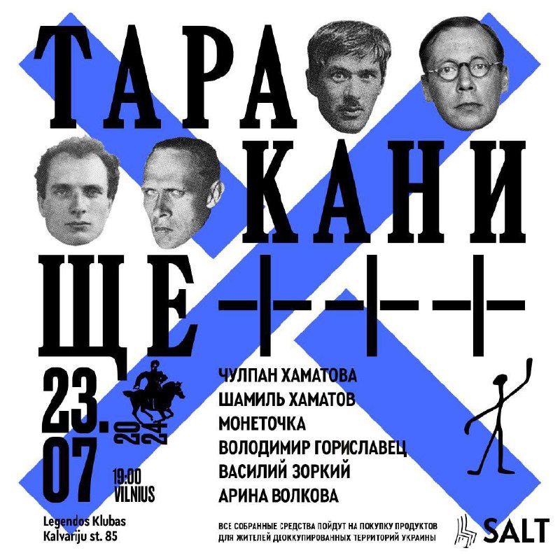 Мы рады представить вашему вниманию наших друзей, проект SALT! Благодаря им в Вильнюсе пройдёт спектакль «Тараканище +++ Детские/ недетские стихи»! Читка состоится завтра, 23 июля 2024 года, в 19:00 в «Legendos» Klubas, Kalvarijų g. 85,Vilnius.