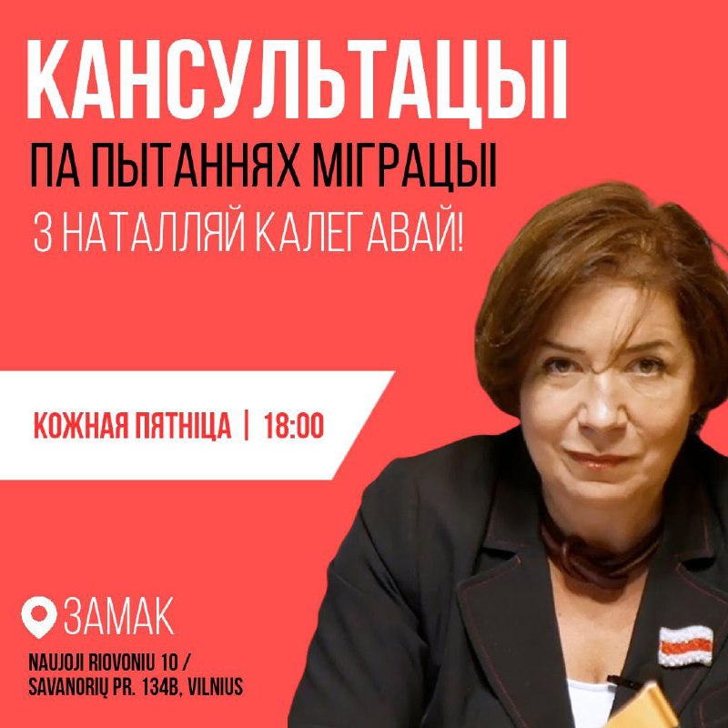 Паважанае спадарства, Сення (пт) 5 ліпеня з 18:00, Наталля Калегава будзе праводзіць у Замку трад… 05.07.2024Dapamoga LT | Замак у Вільнюсе Паважанае спадарства, Сення (пт) 5 ліпеня з 18:00, Наталля Калегава будзе праводзіць у Замку традыцыйныя кансультацыі па пытаннях міграцыі. Папярэдні запіс – абавязковы:@natalex_dapamoga Чакаем Вас!Замак, Naujoji Riovoniu 10