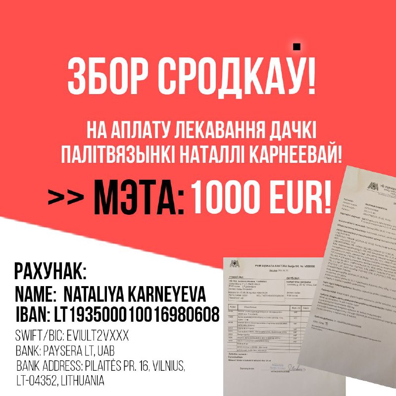 Грошы для Багданы Карнеевай дасылайце, калі ласка на рахунак маці, Наталлі Карнеевай, у Paysera: