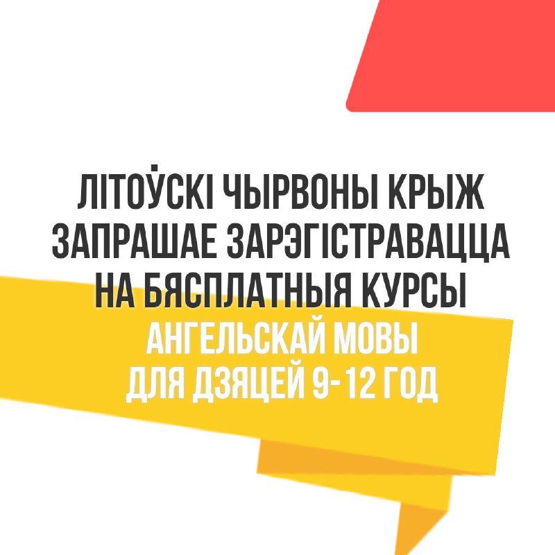 Запрашаюцца дзеткі ва ўзросце ад 9 да 12 гадоў, якія пражываюць у Літве, на ўрокі англійскай мовы ў… 23.04.2024Dapamoga LT | Замак у Вільнюсе Запрашаюцца дзеткі ва ўзросце ад 9 да 12 гадоў, якія пражываюць у Літве, на ўрокі англійскай мовы ў Чырвоным Крыжы ў Вільні.Набіраецца група, якая пачне заняткі 3 траўня і будзе праходзіць кожную пятніцу ў 17.00. Рэгістрацыя >>>