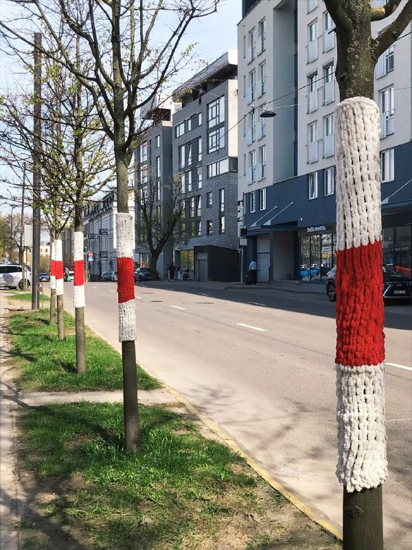 А вось і тое самае месца ў Вільні, дзе дрэвы ўхуталіся ў бчб-шалікі: перад Беламбасадай, ля Варты святла !) Створана клапатлівым рукамі беларускай партызанкі, што жыве ў Замку. Давайце аддзячым майстрыцы падабайкамі і агеньчыкамі!