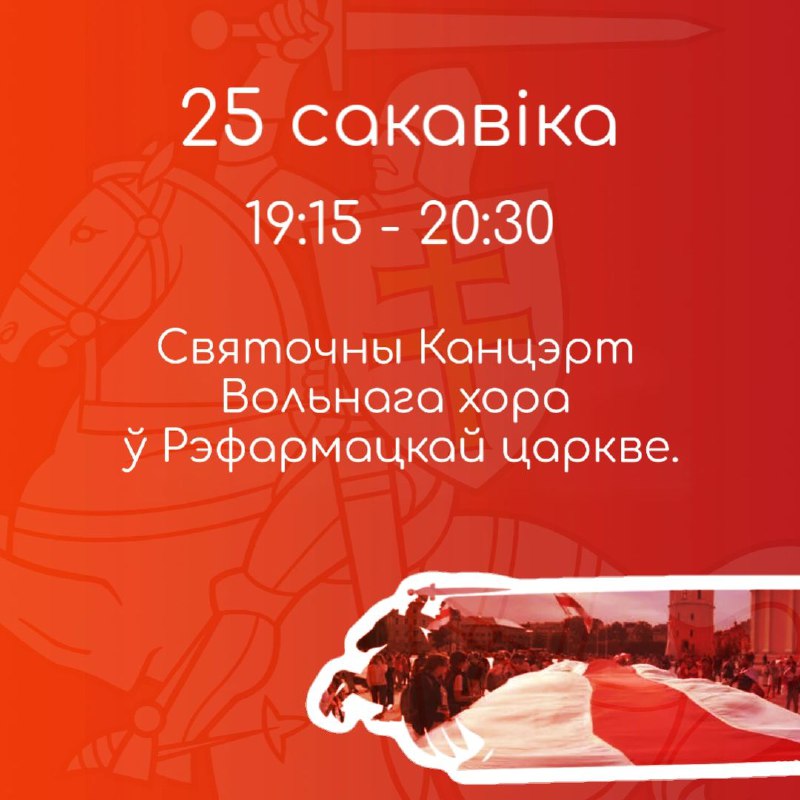 Пачатак канцэрта сінхранізаваны з рухам святочнай калонны і плануецца: 25 сакавіка, Пн | 19:15 ў Рэфармацкай царкве. Уваход вольны