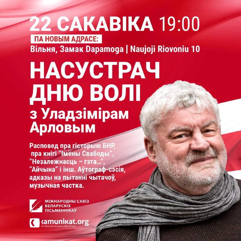 запрашаем вас у пятніцу 22 сакавіка на сустрэчу з Уладзімірам Арловым у Замак а 19:00!Сутрэча з беларускім гісторыкам і аўтарам, прысвечана святу Дня Волі, 106-годдзю абвяшчэньня Незалежнасьці БНР. Нас чакае расповед пра гісторыю БНР.