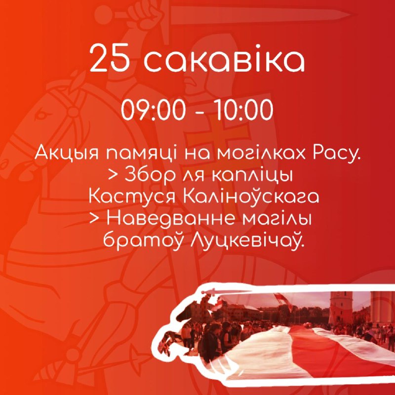 Акцыя ўшанавання памяці дзеячоў БНР Апасля – запрашаем на вольны бчб-аўтапрабег па Вільні! Рэгістра… 21.03.2024Dapamoga LT | Замак у Вільнюсе Акцыя ўшанавання памяці дзеячоў БНР Апасля – запрашаем на вольны бчб-аўтапрабег па Вільні! Рэгістрацыя >Збор: 25 сакавіка, пн | 09:00 Ля капліцы Кастуся Каліноўскага на могілках Расу (Rasų g. 32), Вільня Праграма ўсіх святочных мерапрыемстваў: 24 сакавіка – тутака >> 25 сакавіка – тутака >>
