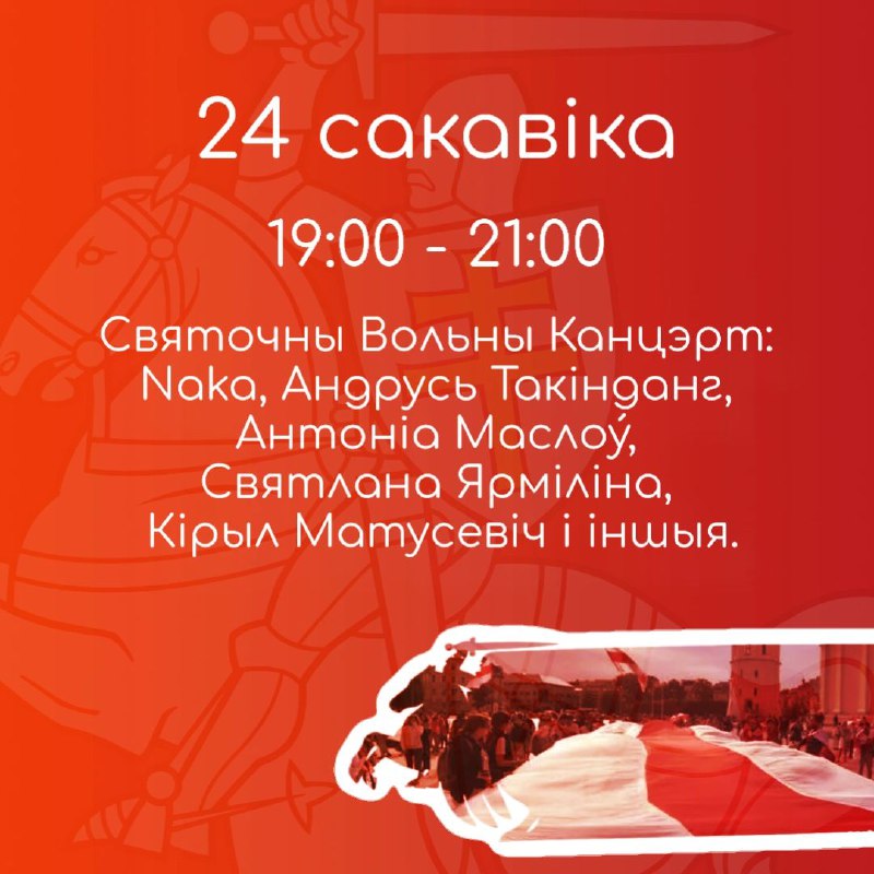 Святочны Вольны канцэрт у Замку!Вас чакаюць выступы беларускіх рокавых музыкаў: NAKA (Анастасія Шпа… 21.03.2024Dapamoga LT | Замак у Вільнюсе Святочны Вольны канцэрт у Замку!Вас чакаюць выступы беларускіх рокавых музыкаў: NAKA (Анастасія Шпакоўская) PASTGHOSTER (Кірыл Матусевіч) АНТОНІА МАСЛОЎ (былы палітвязень Антон Маслыка) АНДРУСЬ ТАКІНДАНГ СВЯТЛАНА ЯРМІЛІНА і іншыя! Пад час канцэрта можна будзе набыць прадукцыю з нацыянальнымі сымбалямі. Сродкі ад продажу пойдуць на карысьць экстрана эміграваўшым беларускім палітуцекачам. Уваход вольны! 24 сакавіка, ндз | 19:00 Замак (Naujoji Riovoniu gatve 10), Вільня Праграма ўсіх святочных мерапрыемстваў: 24 сакавіка – тутака >> 25 сакавіка – тутака >>