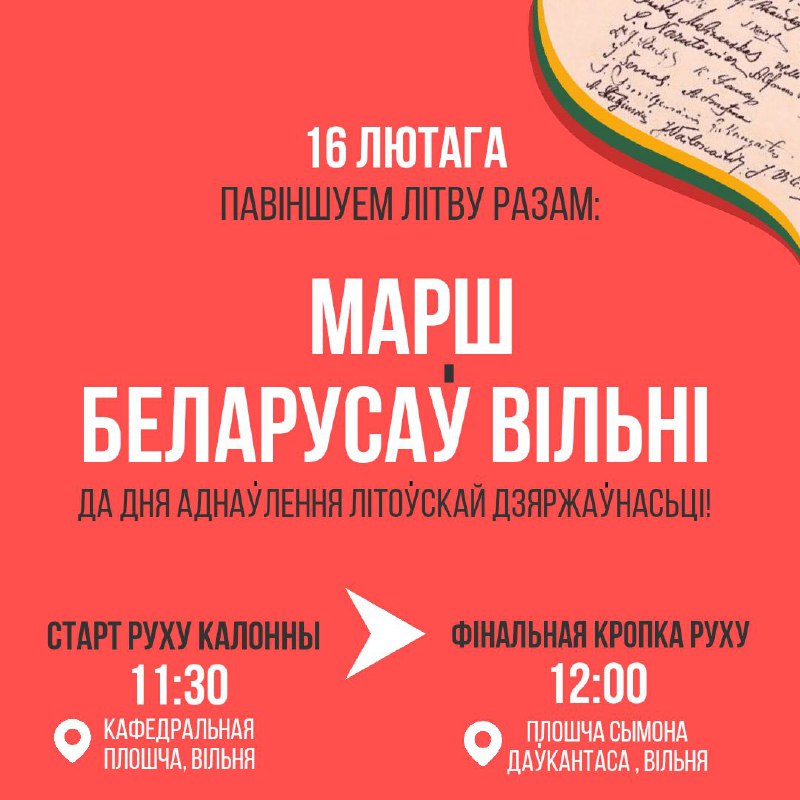 Добрай раніцы, сябры! Нагадваем, што сёння з 11:20 да 11:30 збіраемся на Кафедральнай плошчы на Марш беларусау́ Вільні, прысвечаны Дню аднау́лення Літоу́скай Дзяржау́насьці.