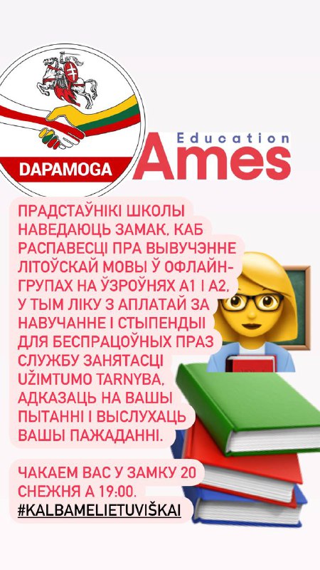 Прадстаўнікі школы наведаюць Замак, каб распавесці пра вывучэнне літоўскай мовы ў офлайн-групах на ўзроўнях А1 і А2, у тым ліку з аплатай за навучанне і стыпендыі для беспрацоўных праз службу занятасці Užimtumo tarnyba, адказаць на вашы пытанні і выслухаць вашы пажаданні. Чакаем вас у Замку 20 снежня а 19:00.
