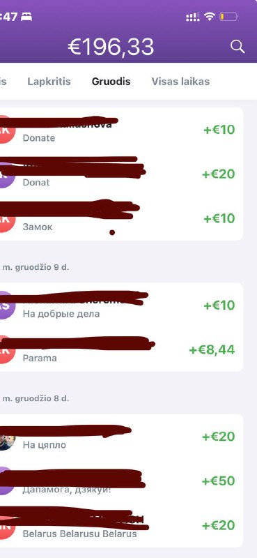 Данатамі назбірана 150 еўра за 2 дні плюс 90 еўра наяўнымі ад некалькіх жыхароў Замка. Так мы здолелі сабраць сродкі за аплату паловы рахунка за святло за лістапад. Мэта збору: 360-240 святло = 120, вада 140, чакаем за газ 1500 і за вываз смецця 70.