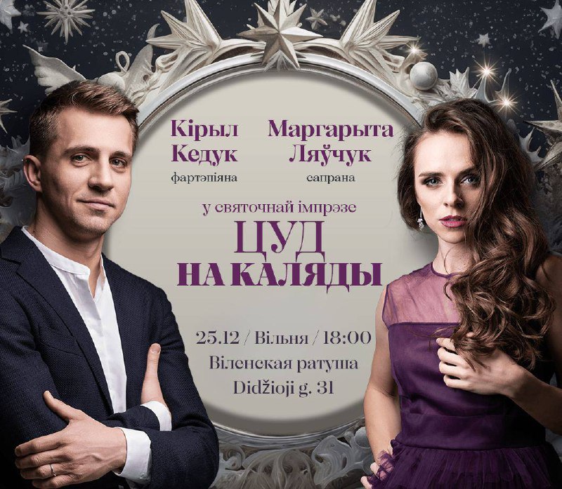 25 снежня ў Віленскай ратушы адбудзецца святочная імпрэза “ЦУД НА КАЛЯДЫ” з удзелам выкшталцоных беларускіх артыстаў – спявачкі Маргарыты Ляўчук і піяніста Кірыла Кедука. Ва ўтульнай каляднай і пераднавагодняй атмасферы артысты выканаюць беларускія і еўрапейскія калядкі, а таксама творы Баха, Моцарта, Шапэна, Манюшкі, Штраўса і Бернстайна.