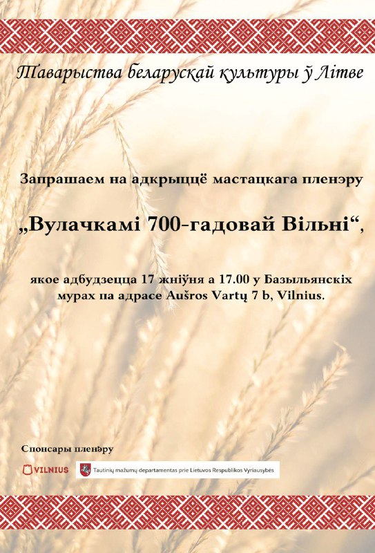 Дарагія сябры!Шчыра запрашаем на адкрыццё мастацкага пленэру “Вулачкамі 700-гадовай Вільні”, ад Тава… 16.08.2023Dapamoga LT | Замак у Вільнюсе Дарагія сябры!Шчыра запрашаем на адкрыццё мастацкага пленэру “Вулачкамі 700-гадовай Вільні”, ад Таварыства беларускай культуры ў Літве.17 жніўня 17:00Базыльянскія муры (Aušros Vartų g. 7B, Vilnius)