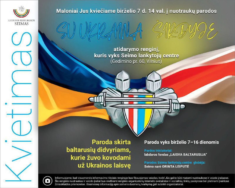 ВЫСТАВА “З УКРАІНАЙ У СЭРЦЫ”Заўтра 7 чэрвеня а 14:00 у візіт-цэнтры Сейма Літвы адбудзецца адкрыццё выставы “З Украінай у сэрцы”.