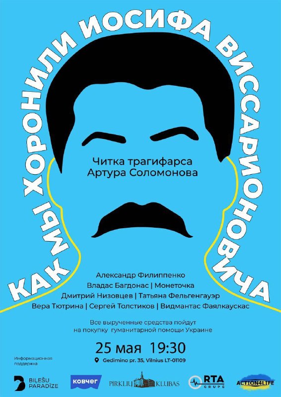 А сёння 25 траўня ў 19:30 на сцэне Pirkliu Klubas (Gedimino pr. 35) адбудзецца дабрачынная чытка трагіфарсу Артура Саламонава.