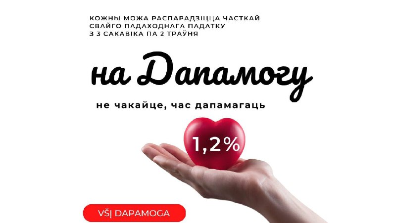 Дарагія сябры! Многія з вас, вашых знаёмых і сваякоў прайшлі праз клапатлівыя рукі Dapamoga, а многія ўжо афіцыйна працуюць і плацяць падаткі. Калі Вы хочаце, каб частка ўжо выплачаных вамі падаткаў, а менавіта – 1,2%, былі пералічаныя адрасна і даступныя пацярпелым беларусам, і таксама аказвалася гуманітарная дапамога складу Dapamoga, просім пры запаўненні падатковай дэкларацыі [у тэрмін да 2 траўня], пералічыце, калі ласка, 1,2% VŠĮ “Dapamoga”, паказваючы imonės kodas 305620218. Перавядзіце 1,2% вашага падаходнага падатку ў падтрымку Všį Dapamoga! З 3 сакавіка па 2 мая любы жыхар Літвы (незалежна ад грамадзянства), які афіцыйна атрымлівае даходы ў Літве, можа распарадзіцца часткай свайго падаходнага падатку і перадаць 1,2% Všį Dapamoga. Зрабіць гэта можна 3 спосабамі: