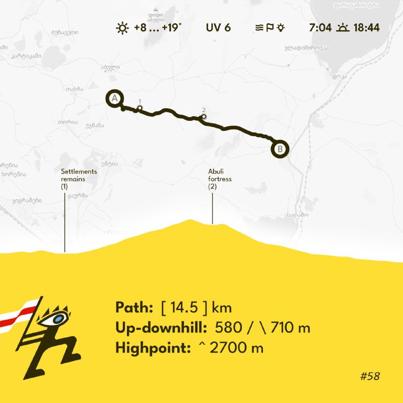 Едзем за возера Паравані – шпацыраваць да цыклапічнай ABULI FORTRESS. Высадзімся за Абульскім перавалам ды пойдзем палямі да вулкана Patara Abuli, на якім месцяцца вялікія і выразныя руіны пабудовы бронзавага веку. На шляху нам сустрэнецца возера, рэшткі некалькіх былых паселішчаў, а таксама, спадзяёмся, не сустрэнуцца алабаі. Фініш у вёсцы Gandzani.