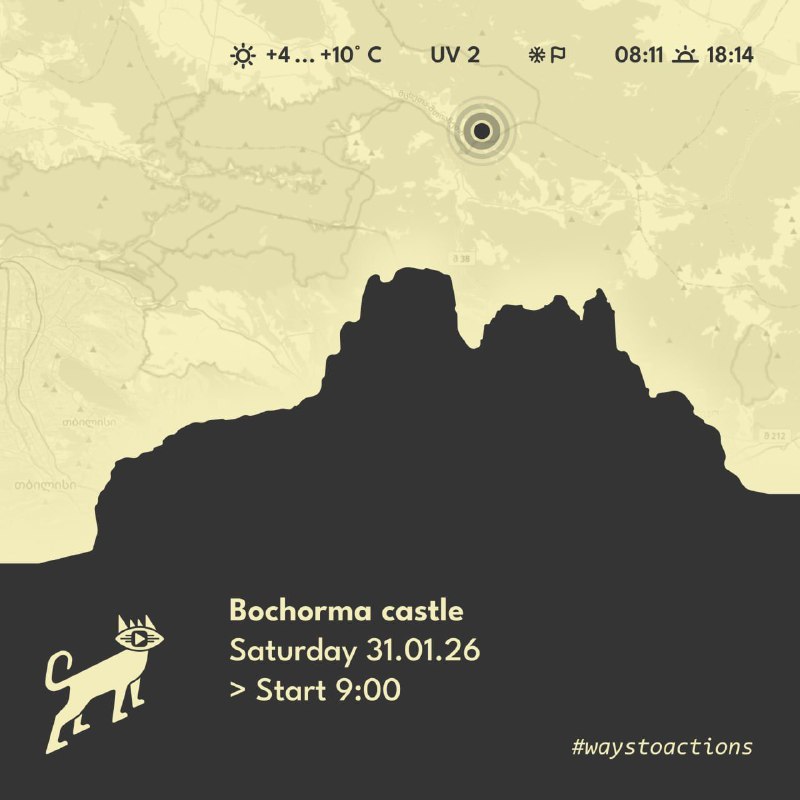 +4…+10°, пераменная сонечнасць. Наведванне пабудоў: 3~4 гадзіны. Трансфер: 50…30 лары з чалавека – у залежнасці ад колькасці ўдзельнікаў (больш людзей – менш кошт).