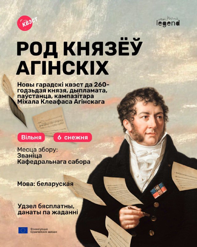 У суботу, 6 снежня, запрашаем на квэст «Род князёў Агінскіх» у Вільні. Вы знойдзеце мясціны, звязаныя з Агінскімі, даведаецеся пра паходжанне роду, выбітных яго прадстаўнікоў, каханне і розныя авантуры, а таксама пачуеце фрагмент паланэза ўжывую. Пасля квэста далучайцеся да вечарыны з адмысловым госцем і канцэрт-лекцыяй пра Агінскага.