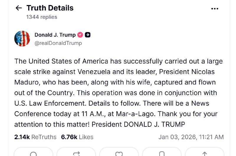 «Злучаныя Штаты Амэрыкі пасьпяхова правялі маштабны ўдар па Вэнэсуэле і яе лідэру, прэзыдэнце Нікалясу Мадуры, які разам зь яго жонкай быў захоплены ў палон і вывезены з краіны», — напісаў Дональд Трамп у сацыяльнай сетцы Truth Social.