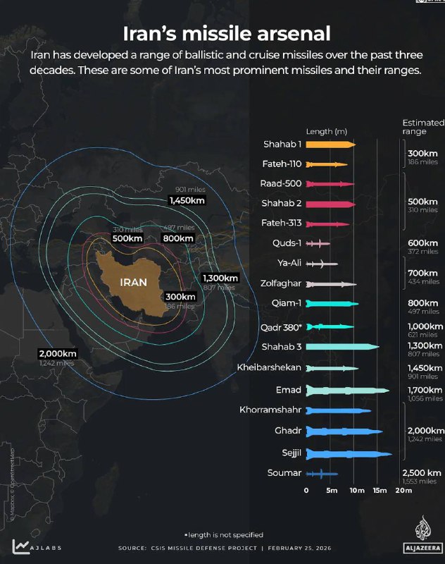 Аль-Джазира показывает дальность ракет, которыми обладает иранская армия.За три десятилетия Иран раз… 28.02.2026Мінск Навіны Аль-Джазира показывает дальность ракет, которыми обладает иранская армия.За три десятилетия Иран разработал ряд ракет с предполагаемой дальностью от примерно 300 до 2 500 километров.