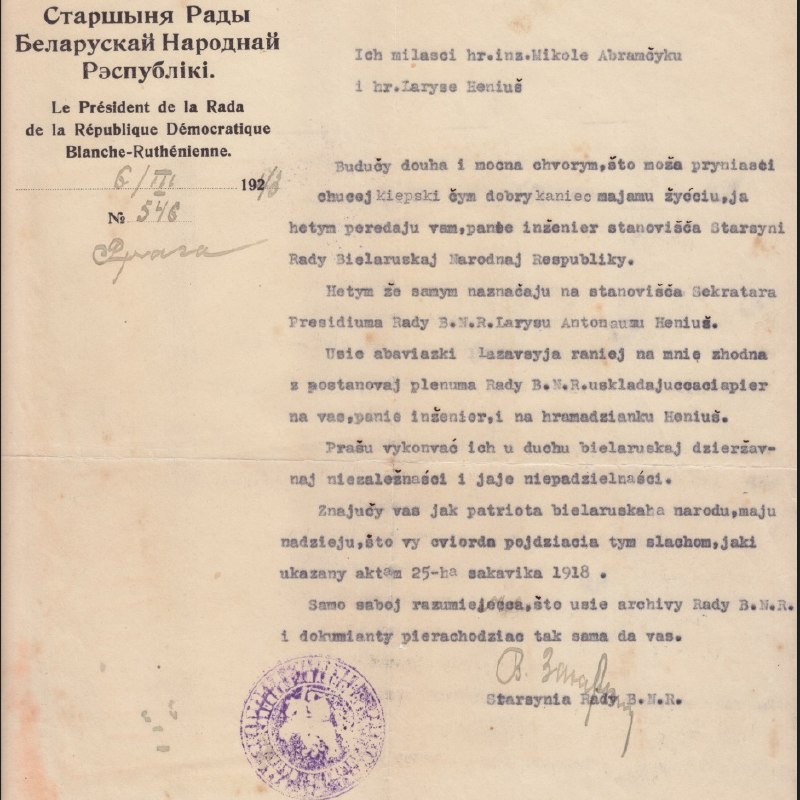 Сакратар Рады Беларускай Народнай Рэспублікі і Апякунская рада Беларускай Бібліятэкі і Музэю імя Ф. Скарыны ў Лёндане радыя паведаміць аб перадачы Бібліятэцы часткі дзяржаўнага архіву БНР, які зьберагаўся ў с.п. Старшыні Рады БНР Міколы Абрамчыка.