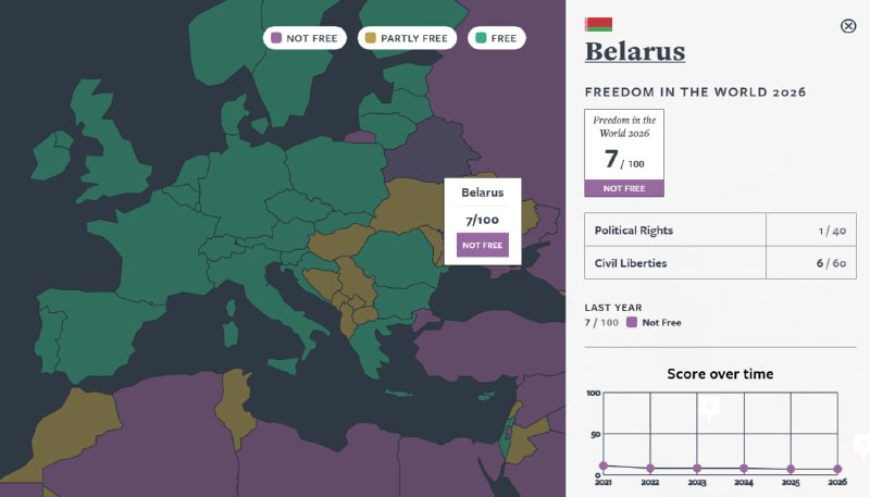 Ожидаемо, Беларусь набрала всего 7 баллов из 100 возможных и оказалась среди государств с наименьшими показателями свободы в мире. Информацию о Беларуси можно посмотреть здесь.