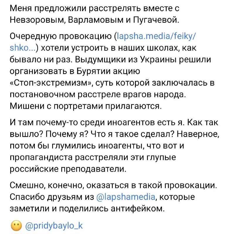 Расстреливали, конечно же по старым забытым традициям “врагов народа”. Преданы винтовке были: Илья Яшин, Максим Кац, Александр Невзоров, Петр Верзилов, Илья Варламов, Михаил Ходорковский, Юрий Дудь, Марк Фейгин и, конечно же, Алла Пугачева! Остальные не…
