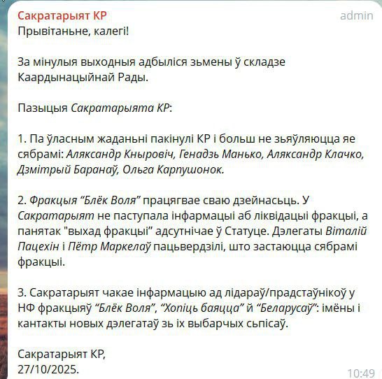 У сувязі з маніпуляцыямі наконт нашага сыхода з Каардынацыйнай рады з боку сакратарыята КР пад кіраўніцтвам таварыша Краўцова, удакладняем: