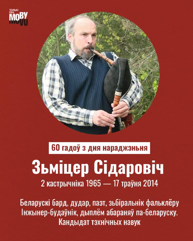 Сёньня 60 гадоў з дня нараджэньня Зьмітра Сідаровіча, нястомнага творцы, які вяртаў беларускай мове … 02.10.2025Вольны Захад інфа Сёньня 60 гадоў з дня нараджэньня Зьмітра Сідаровіча, нястомнага творцы, які вяртаў беларускай мове энэргію, годнасьць і будучыню празь песьню — ад мужных рыцарскіх гімнаў да дзіцячых сьпеваў на ўсе нагоды.