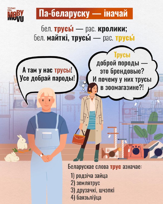 * Падобныя словы ў розных мовах могуць азначаць зусім рознае. * Як беларускае трус і расейскае „трус“ (у адзіночным ліку). Хоць яны ад таго самага кораня з значэньнем ‘трэсьці’. * Беларускае слова шматзначнае: трус — і вушастая жывёлка, і трэсачкі, і землятрус, і нават ператрус, а як баязьлівец — пазычаньне з расейскай. * Расейскае ж слова „трусы́“ для ніжняй бялізны — францускага паходжаньня (а беларускія майткі — галяндзкага).