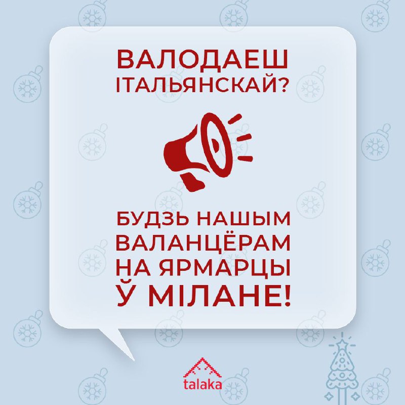 Ты патрэбны ў Мілане на адным з самых буйных калядных кірмашоў. Трэба, каб ты ведаў італьянскую мову, меў свабодныя 8 і 9 снежня і не баяўся людзей (гэта ж кірмаш!..)
