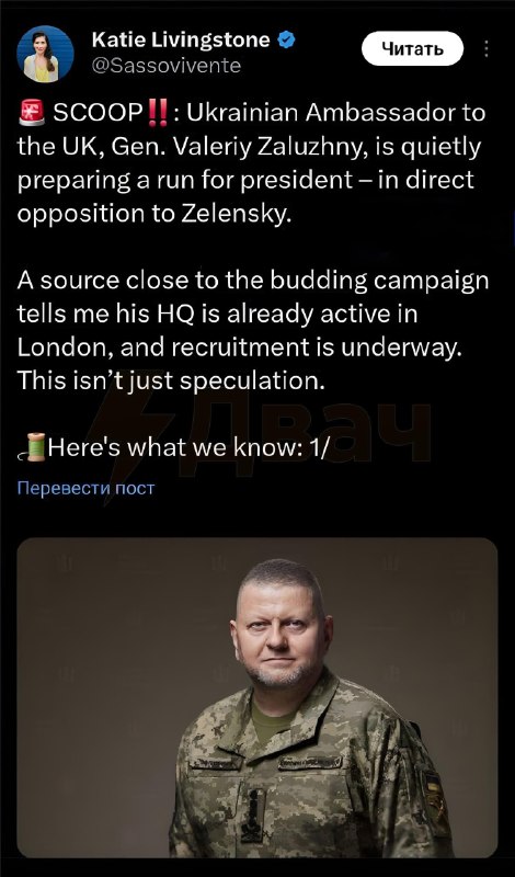 Залужный тайно готовится баллотироваться в президенты УкраиныПо данным журналистки из США Ливингстон… 25.08.2025Нацыянальная бясьпека. Дайджэст Залужный тайно готовится баллотироваться в президенты УкраиныПо данным журналистки из США Ливингстон, у предвыборной команды экс-главкома ВСУ уже есть штаб-квартира в Лондоне.