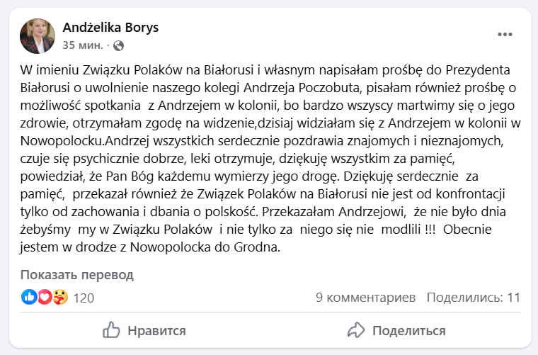 От имени Союза поляков в Беларуси и от себя лично я написала просьбу президенту Беларуси об освобождении нашего коллеги Анджея Почобута, а также просьбу о возможности встречи с Анджеем в колонии, потому что все мы очень беспокоимся о его здоровье. Я получила разрешение на свидание, сегодня я встретилась с Анджеем в колонии в Новополоцке. Анджей сердечно приветствует всех знакомых и незнакомых, он чувствует себя хорошо психологически, получает лекарства, благодарит всех за память, сказал, что Бог каждому определит его путь. Спасибо за то, что помните о нем. Он также передал, что Союз поляков в Беларуси не стремится к конфронтации, а только к сохранению и укреплению польской идентичности. Я передала Анджею, что не было ни одного дня, когда мы в Союзе поляков и не только за него не молились! Сейчас я еду из Новополоцка в Гродно.