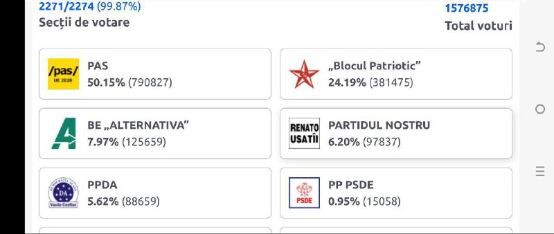ЦИК Молдовы после обработки 99,87% протоколов заявил, что проевропейская партия PAS («Действие и Солидарность») президента Санду победила на парламентских выборах с 50,15% голосов