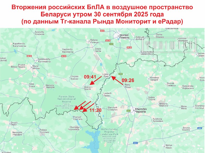 Около 11:40 над территорией Гомельской области были зафиксированы ещё три БПЛА, летевшие в направлении города-призрака Припять.
