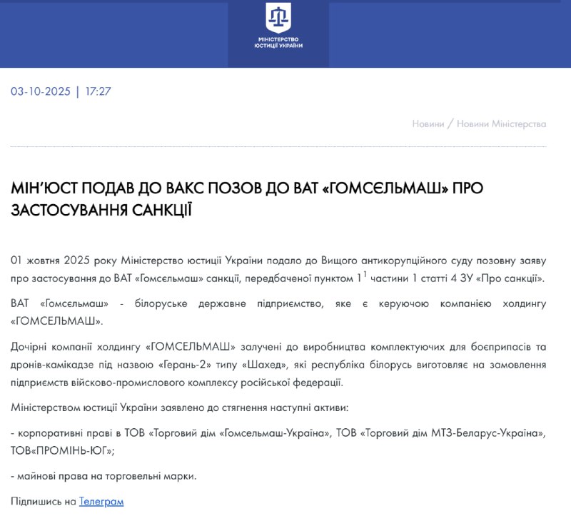 Минюст Украины указывает, что причиной иска стало то, что дочерние компании холдинга “Гомсельмаш” привлечены к производству комплектующих для боеприпасов и дронов-камикадзе под названием “Герань-2” типа “Шахед“, которые Беларусь производит по заказу предприятий военно-промышленного комплекса России.