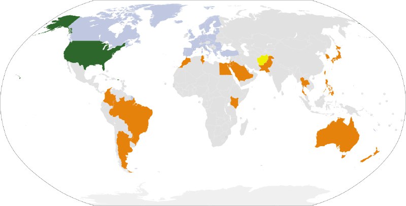 Актуальная карта с основными союзниками США вне НАТО (оранжевым).