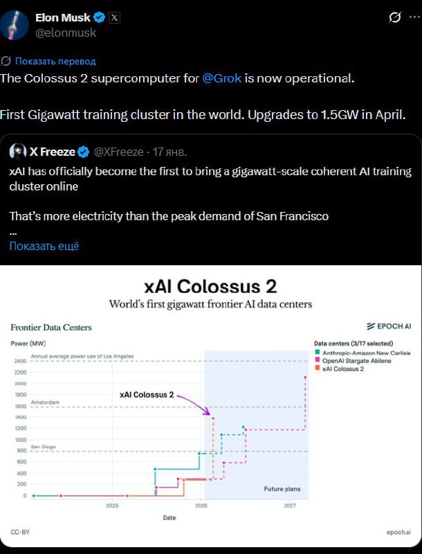 На фоне всех новостей Илон Маск под шумок сообщил, что его ИИ-стартап xAI запустил собственный крупный вычислительный центр Colossus 2 для обучения своих моделей искусственного интеллекта.