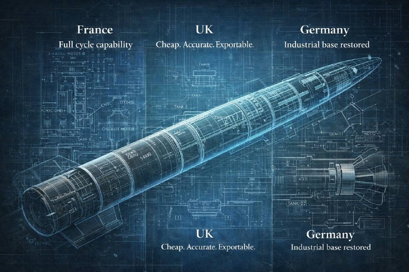 Франція залишається єдиною країною в Європі, яка зберегла повний замкнений цикл балістичного ракетобудування. Вона контролює весь ланцюг — від хімії та твердого палива до складних бойових частин із роздільним наведенням. Ключовим елементом цієї системи є ArianeGroup, яка серійно виробляє стратегічні балістичні ракети для підводних човнів і володіє компетенціями міжконтинентального рівня. Паралельно Франція запускає програму MBT — наземної конвенційної балістичної ракети з дальністю 1000–2000 км. Технічно Франція здатна створити ракету будь-якого класу. Основне обмеження — не інженерія, а масштаб виробництва, оскільки вся система роками була орієнтована на невеликі серії стратегічних носіїв.