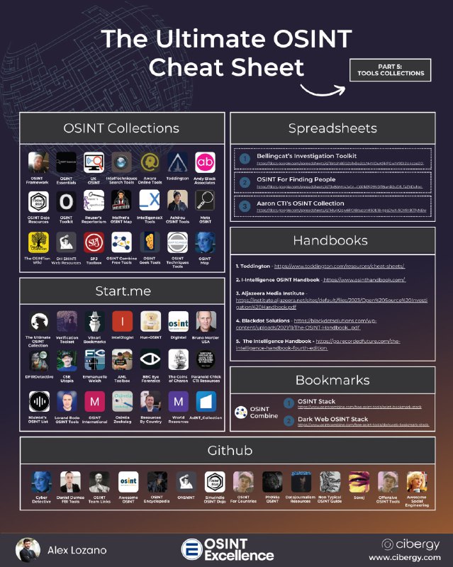 Колекція з понад 40 OSINT-шпаргалок містить практичні та корисні поради для проведення розслідувань і розвитку ваших навичок. Минулого року Alex Lozano (Cibergy) на своїй сторінці в повідомляв, що колекція містить понад 25 шпаргалок і щотижня поповнюється новими матеріалами. З того часу її розширили та оновили.