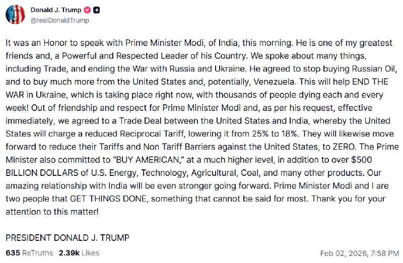“Имел честь говорить с премьер-министром Моди. <…> Он согласился прекратить покупать российскую нефть и увеличить закупки у США и, потенциально, Венесуэлы. <…> Мы заключили торговую сделку, по которой США снизят пошлины с 25% до 18%, а Индия снизит пошлины до НУЛЯ”.